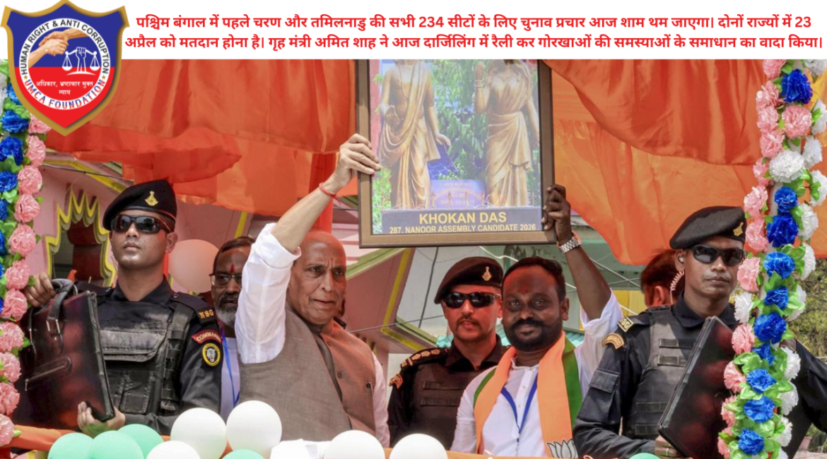 दार्जिलिंग/चेन्नई/कोलकाता: भारतीय लोकतंत्र के महापर्व के तहत पश्चिम बंगाल और तमिलनाडु में आज चुनावी प्रचार का शोर थमने जा रहा है। पश्चिम बंगाल विधानसभा चुनाव के पहले चरण (152 सीटें) और तमिलनाडु की सभी 234 सीटों पर आगामी 23 अप्रैल को मतदान होना है। नियमानुसार, मतदान से 48 घंटे पहले...
