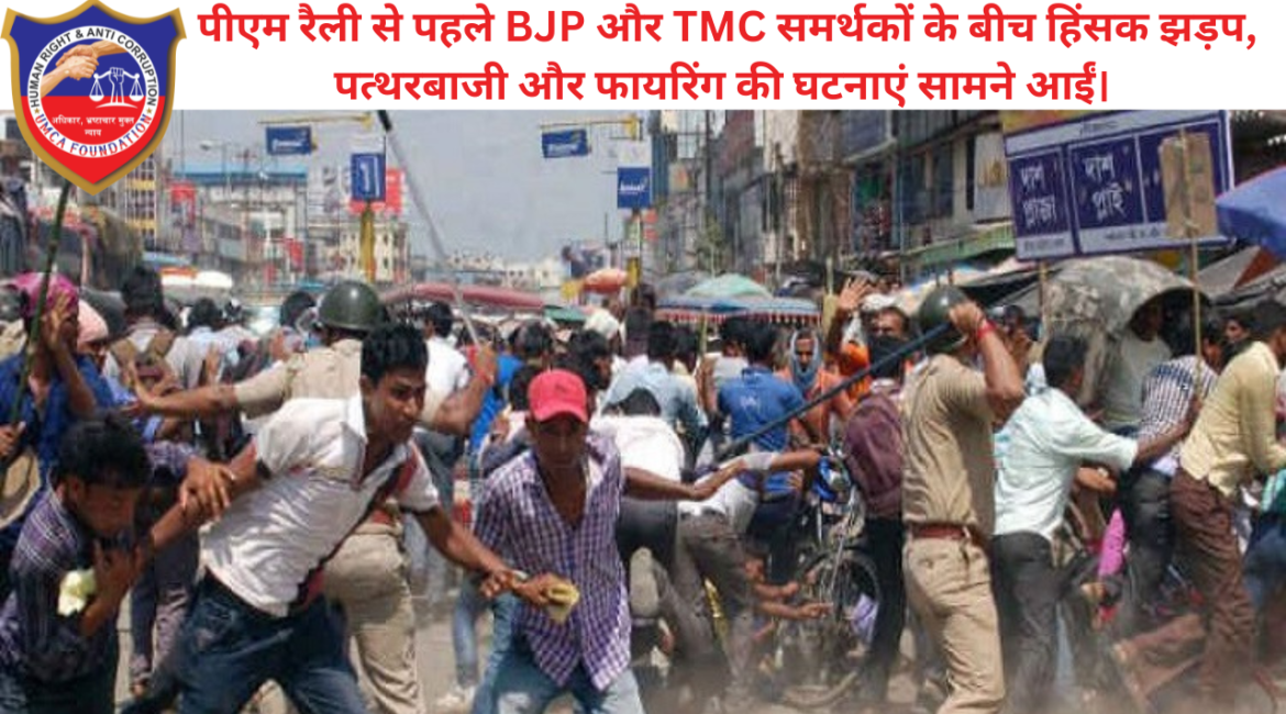 पश्चिम बंगाल में चुनावी माहौल के बीच एक बार फिर हिंसा की खबरें सामने आई हैं। प्रधानमंत्री की प्रस्तावित रैली से ठीक पहले भारतीय जनता पार्टी (BJP) और तृणमूल कांग्रेस (TMC) के समर्थकों के बीच गंभीर झड़प हो गई।